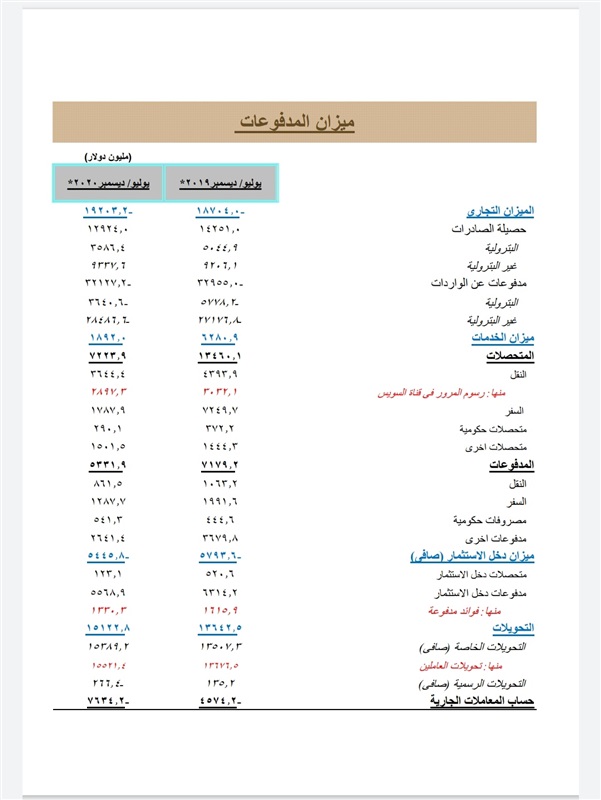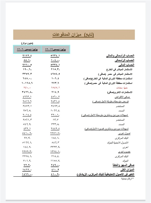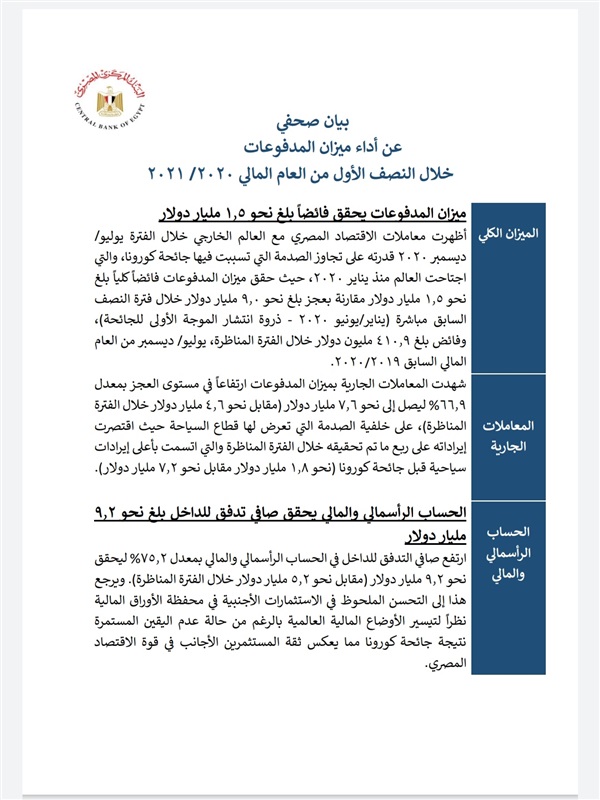 . أعلن البنك المركزي المصري، تحقيق ميزان المدفوعات المصري فائض بلغ 1.5 مليار دولار خلال النصف الثاني من العام الماضي (الفترة من يوليو وحتى ديسمبر 2020)، مقارنة مع عجز قدره 9 مليارات دولار في النصف الأول من العام.