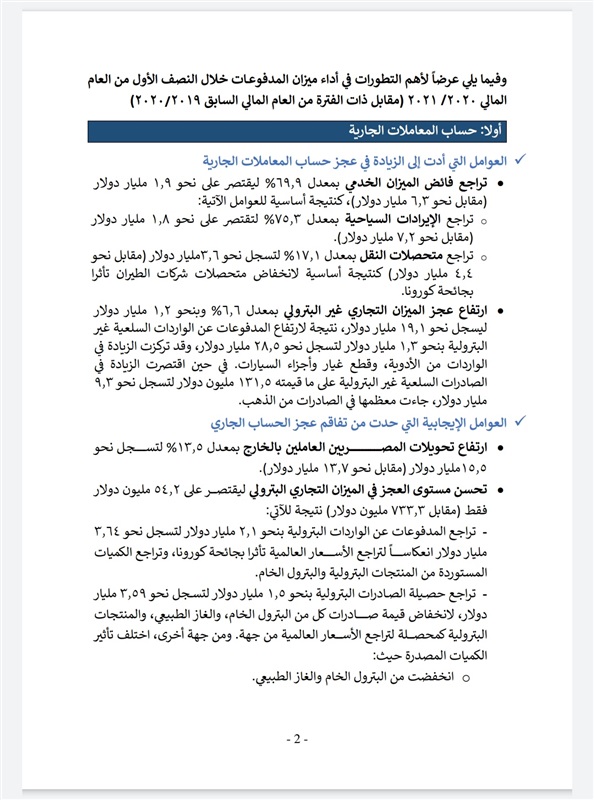 وأرجع التقرير، الزيادة في عجز حساب المعاملات الجارية الى تراجع فائض الميزان الخدمي بمعدل 69.9 في المائة الى 1.9 مليار دولار مقابل 6.3 مليار دولار في الفترة المناظرة وذلك بسبب تراجع إيرادات السياحة بمعدل 75.3 في المائة لتقتصر على 1.8 مليار دولار فقط مقابل 7.2 مليار دولار في الفترة المناظرة من العام السابق، بالاضافة إلى تراجع متحصلات النقل بمالعام السابق، بالاضافة إلى تراجع متحصلات النقل بمعدل 17.1 في المائة الى 3.6 مليار دولار نتيجة انخفاض متحصلات شركات الطيران تأثرا بتداعيات جائجة كورونا.