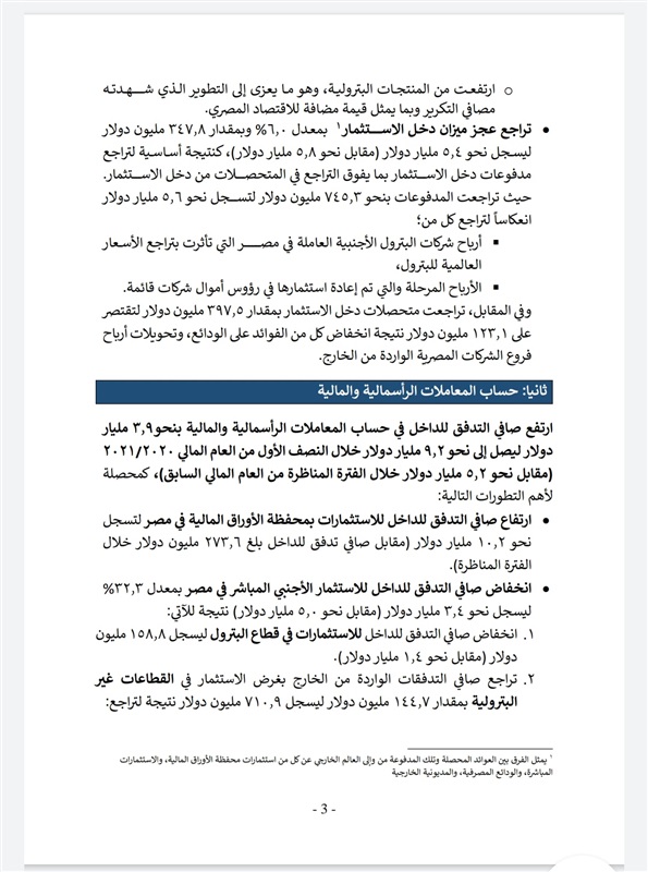 وأوضح التقرير، أن صافي التدفق للداخل في الحساب الرأسمالي والمالي ارتفع بمعدل 75.2 في المائة ليحقق 9.2 مليار دولار مقابل 5.2 مليار دولار خلال الفترة المناظرة من العام السابق وذلك على خلفية التحسن الملحوظ في الاستثمارات الأجنبية في محفظة الأوراق المالية نظراً لتيسير الاوضاع المالية العالمية بالرغم من حالة عدم اليقين المستمرة نتيجة جائحة كورونا ما يعكس ثقة المستثمرين الاجانب في قوة الاقتصاد المصري.
