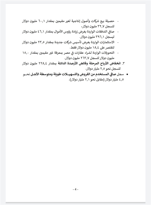 كما ارتفع صافي التدفق للداخل في حساب المعاملات الرأسمالية والمالية بنحو 3.9 مليار دولار ليصل إلى 9.2 مليار دولار خلال النصف الثاني من العام الماضي 2020 مقابل 5.2 مليار دولار خلال الفترة المماثلة من العام السابق، نتيجة ارتفاع صافي التدفق للداخل للاستثمارات بمحفظة الأوراق المالية في مصر لتسجل 10.2 مليار دولار مقابل تدفق للداخل بلغ 273.6 مليون دولار خلال الفترة المناظرة.