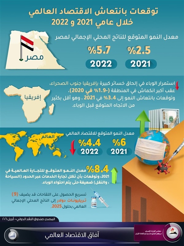 . نشر مركز المعلومات ودعم اتخاذ القرار بمجلس الوزراء المصري، انفوجرافا استعرض خلاله توقعات متفائلة نشرها صندوق النقد الدولي في أبريل الجاري؛ بانتعاش الاقتصاد العالمي خلال عامي 2021 و2022.