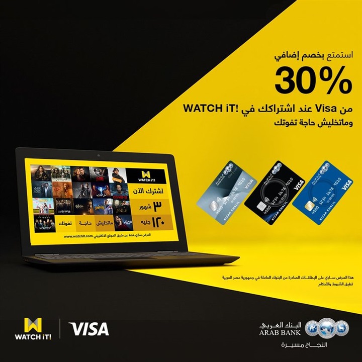 . بمناسبة شهر رمضان أعلن البنك العربي، عبر صفحته الرسمية على موقع التواصل الاجتماعي “فيس بوك”، لعملائه عن فرصة الحصول على خصم 30% عند الاشتراك في منصة ” WATCH IT”، وذلك عند الدفع باستخدام بطاقات Visa البنك العربي.