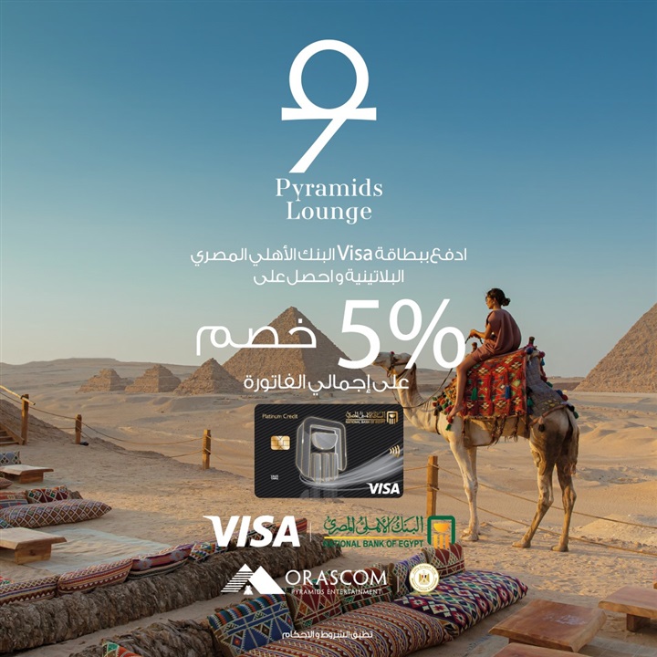 . أعلن البنك الأهلي المصري، عبر صفحته الرسمية على موقع التواصل الإجتماعي “فيس بوك”، لعملائه حاملي بطاقات فيزا البنك البلاتينية عن إمكانية الخصول على خصم 5% على إجمالي الفاتورة في 9 Pyramids Lounge، وذلك عند الدفع ببطاقات Visa البنك البلاتينية، وتأتي الشروط والأحكام كالتالي: