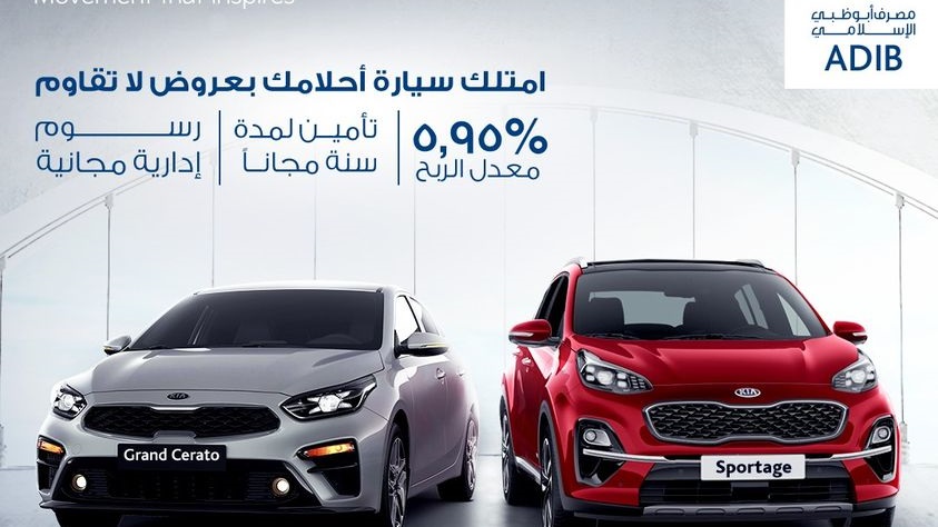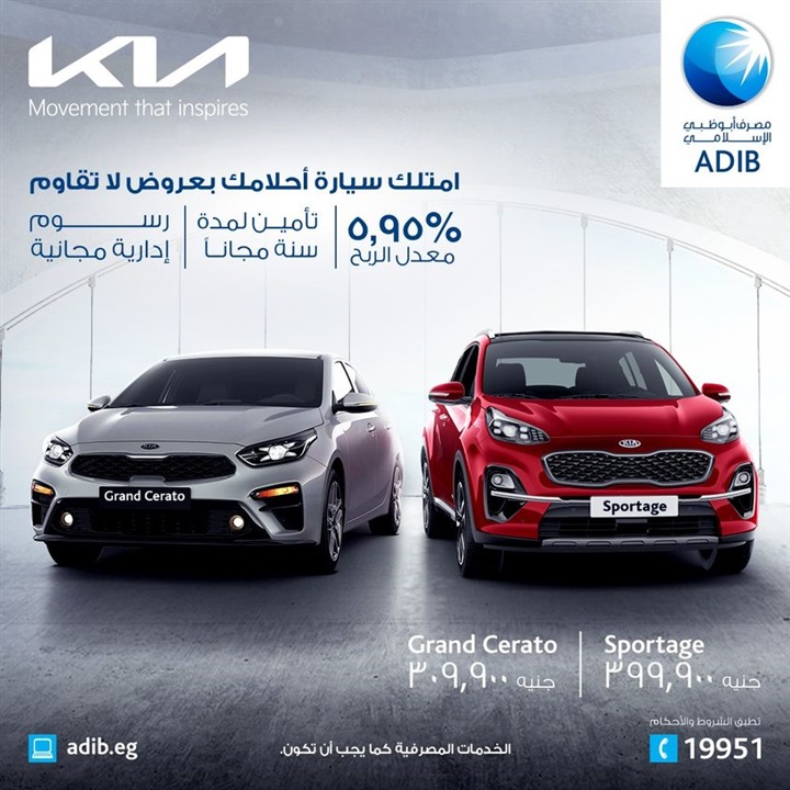 . يقدم مصرف أبوظبي الإسلامي – مصر، لعملائه قرض تمويل السيارات من Kia Egypt بعروض لا تقاوم على سيارات (سپورتاچ وجراند سيراتو)، وذلك بمعدل ربح 5.95% وبتأمين لمدة سنة مجانًا، بالإضافة إلى رسوم إدارية مجانًا.