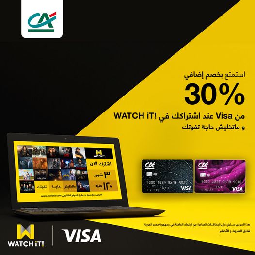 أعلن بنك كريدي أجريكول- مصر، عبر صفحته الرسمية على موقع التواصل الاجتماعي “فيس بوك”، لعملائه عن فرصة الحصول على خصم 30% عند الاشتراك في منصة “WATCH IT”، وذلك عند الدفع باستخدام بطاقات Visa بنك كريدي أجريكول.