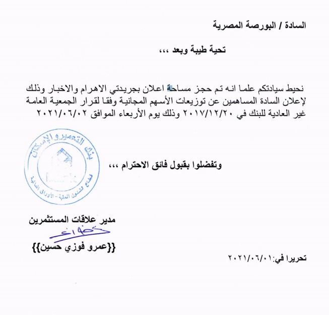 . قال بنك التعمير والإسكان، في بيان للبورصة اليوم، الثلاثاء، إنه تقرر زيادة رأس المال المصدر والمدفوع من 1.26 مليار جنيه إلى 1.52 مليار جنيه بزيادة قدرها 253 مليون جنيه.
