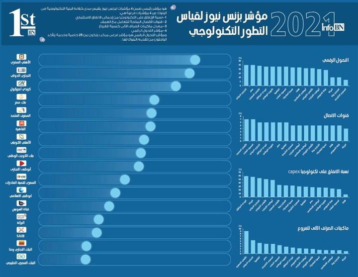 وتصدر البنك الأهلي المصري مؤشر بزنس نيوز للتكنولوجيا وهو ثالث مؤشرات بزنس نيوز الرئيسية التى يتكون منها مؤشر بنك العام بعد النمو والكفاءة. واستمر البنك فى حصد سياسته بالتوسع فى خدماته التكنولوجية إضافة إلى امتلاكه أكبر عدد من الصرافات الآلية فى القطاع مقارنة مع عدد الفروع بمعدل 9 صرافات مقابل كل فرع، وبفارق كبير عن أقرب منافسيه. كما مقابل كل فرع، وبفارق كبير عن أقرب منافسيه. كما جاء البنك ثانيا على المؤشر الفرعى للخدمات الرقمية بعد بنكى التجارى الدولى ومصر اللذين تقاسما صدارة هذا المؤشر، إضافة إلى امتلاكه أكبر عدد من قنوات التواصل مع العملاء فى القطاع، وهو ما عوض المركز المتأخر نسبيا للبنك على مؤشر الإنفاق على التكنولوجيا من إجمالى الإنفاق الاستثمارى CAPEX حيث حل سادسا بمعدل 34%. وجاء بنك كريدى أجريكول فى صدارة مؤشر الإنفاق على التكنولوجيا بمعدل 58% من الإنفاق الاستثمارى للبنك ليعكس رغبة البنك فى توسيع تقديم خدماته عبر الوسائل الرقمية، وهو ما وضعه ثالثا على مؤشر بزنس نيوز للتكنولوجيا بعد التجارى الدولى الثانى والأهلى المصرى الأول.