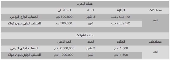 بالنسبة لحسابات الشركات – يستحق العميل جائزة مالية قدرها 1.500 ومضاعفتهم عندما يحتسب متوسط حركة الحساب بحد أدنى 2,500,000 جنيه في مدة ثلاثة أشهر للحسابات الجارية بفائدة، ومتوسط حركة الحساب بحد أدنى مليون جنيه لمدة شهر للحسابات الجارية بدون فائدة.