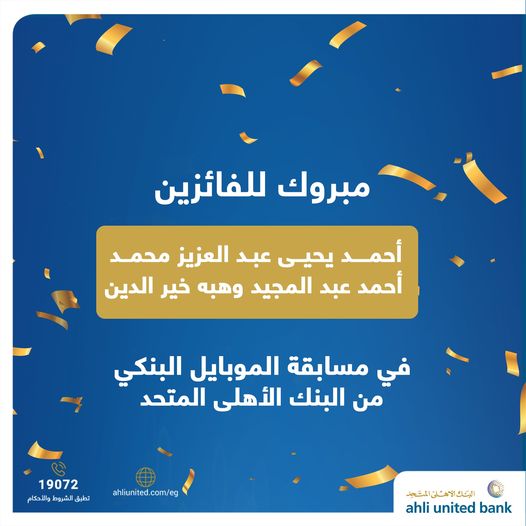 هنّأ البنك الأهلي المتحد- مصر، عبر صفحته الرسمية على موقع التواصل الاجتماعي “فيس بوك”، الفائزين في مسابقة الموبايل البنكي، والفائزين هم كالتالي: