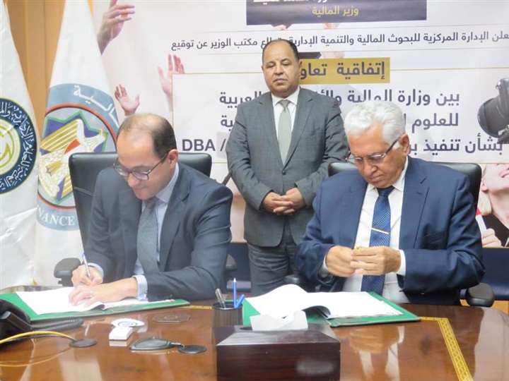 وقع بروتوكول التعاون أحمد كجوك، نائب الوزير للسياسات المالية والتطوير المؤسسى، ود.مصطفى هديب، رئيس الأكاديمية العربية للعلوم الإدارية والمالية والمصرفية، بحضور خالد نوفل، مساعد الوزير للتطوير الإداري، والدكتور عبدالعزيز هاشم، مستشار الوزير للتطوير المؤسسي، وجمال حسين، رئيس الإدارة المركزية للبحوث المالية والتنمية الإدارية.