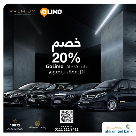 أعلن البنك الأهلي المتحد- مصر، عبر صفحته الرسمية على موقع التواصل الاجتماعي “فيس بوك”، لعملاء بريميوم عن فرصة الحصول على خصم 20% على خدمات “Golimo” من جوباص، وذلك عند استئجار سيارات ليموزين فاخرة.