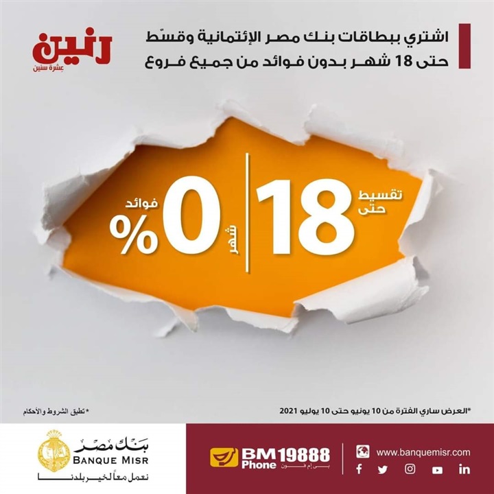 . أعلن بنك مصر، عبر صفحته الرسمية على موقع التواصل الإجتماعي “فيس بوك”، لعملائه عن إمكانية التقسيط من كل فروع رنين على 18 شهرا بدون فوائد، وذلك لحاملي بطاقات ائتمان البنك، وتأتي الشروط والأحكام كالآتي: