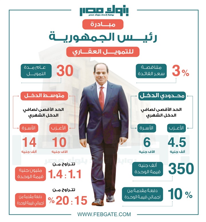 أطلق البنك المركزي المصري مبادرة للتمويل العقاري بتيسيرات تتضمن تخصيص مبلغ 100 مليار جنيه من خلال البنوك أو شركات التمويل العقاري لتمويل شراء الوحدات السكنية لمحدودي ومتوسطي الدخل بسعر عائد متناقص 3% لمدة تصل إلى 30 عاماً.