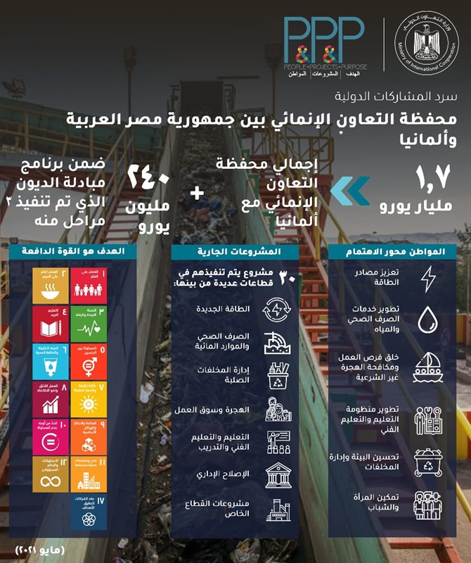 جدير بالذكر أن محفظة التعاون الإنمائي الجارية مع ألمانيا تسجل 1.7 مليار يورو، تم من خلالها تمويل 30 مشروعًا في صورة تمويلات ومنح دعم فني ومساهمات مالية، واستفاد منها العديد من القطاعات من بينها الطاقة والطاقة المتجددة، والصرف الصحي، وتطوير الموارد المائية، وإدارة المخلفات الصلبة، والهجرة، وسوق العمل، والابتكار بالقطاع الخاص، والتعليم الفني، والتدريب المهني، والتنمية الحضرية، والإصلاح الإداري، والمرأة، والشباب، والتنمية المحلية.