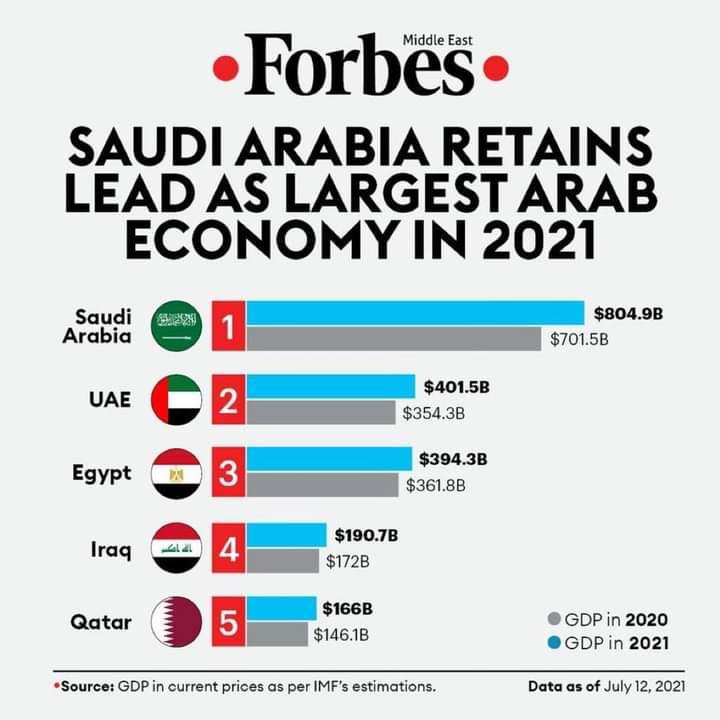 ووفقا لفوربس الأمريكية، وحسب الناتج المحلي لكل دولة، احتفظت السعودية بالمركز الأول لقائمة أكبر الاقتصادات العربية لعام 2021، وتوقعت وصول ناتجها المحلي الإجمالي بالأسعار الجارية إلى 804.9 مليار دولار بنهاية هذا العام، على الرغم من تأثر اقتصادها بأزمة مزدوجة تمثلت في جائحة فيرس كورونا وانهيار أسواق النفط، حيث سجل ناتجها المحلي الإجمالي 701.5 مليار دولار في 2020.
