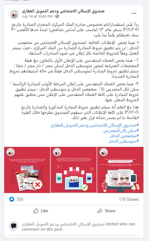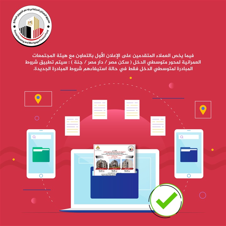 وأضافت فيما يخص العملاء المتقدمين على الإعلان الأول بالتعاون مع هيئة المجتمعات العمرانية لمحور متوسطي الدخل (سكن مصر / دار مصر / جنة): سيتم تطبيق شروط المبادرة لمتوسطي الدخل فقط في حالة استيفاءهم شروط المبادرة الجديدة.