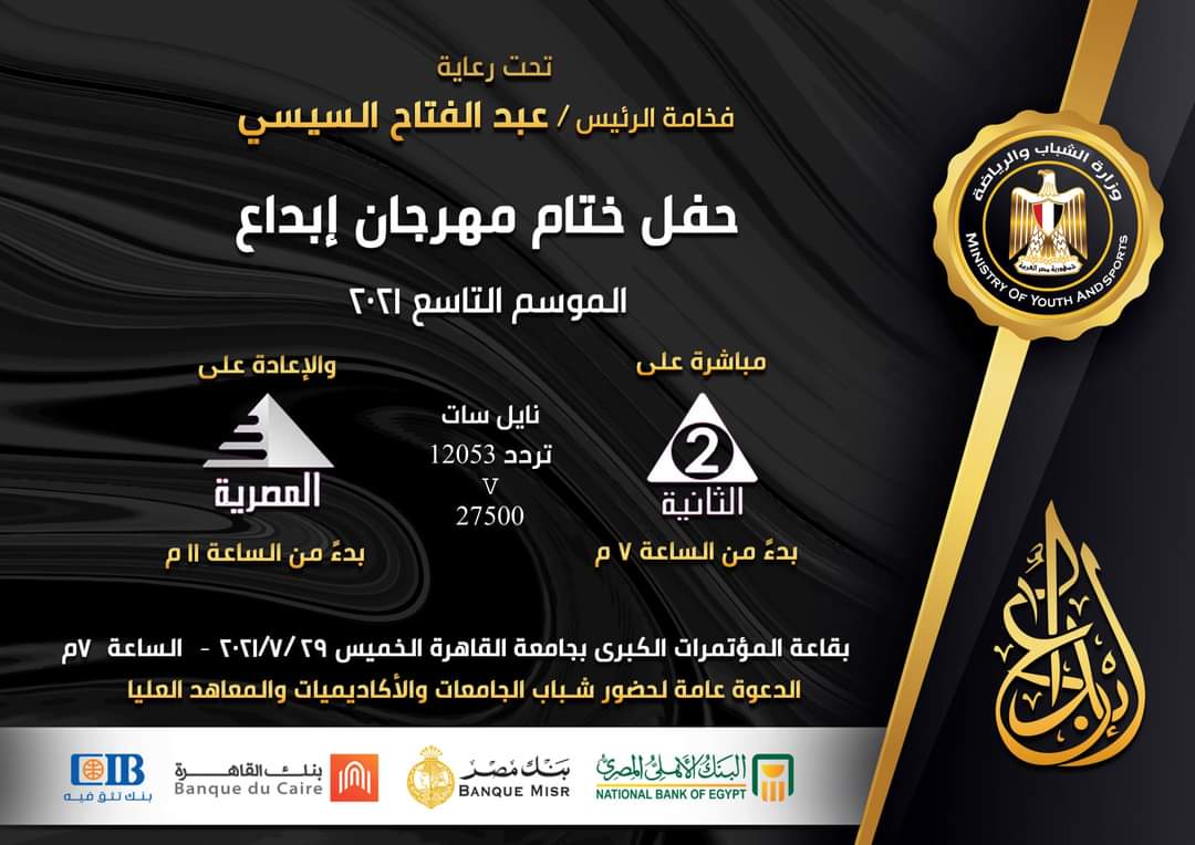 . يقام حفل ختام وتوزيع جوائز مهرجان إبداع الموسم التاسع – في المجالات الأدبية والعلمية والفنية – لشباب الجامعات والمعاهد العليا والأكاديميات الحكومية والخاصة، بقاعة المؤتمرات الكبرى بجامعة القاهرة غدًا الخميس، بدعم من ( البنك الأهلي المصري – بنك مصر – بنك القاهرة – بنك CIB ) ووزارة الشباب والرياضة – الإدارة المركزية للبرامج الثقافية والتطوعية الإدارة العامة للبرامج الثقافية والفنية.