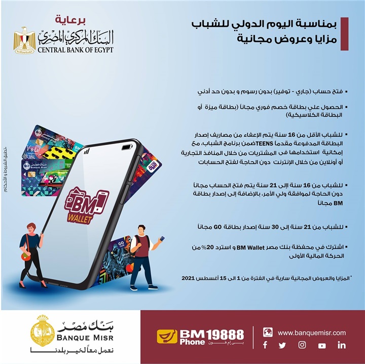 . انطلاقاً من حرص بنك مصر على دعم جهود الدولة في تحقيق الشمول المالي اتساقاً مع رؤية مصر 2030 لتحقيق التنمية المستدامة، أعلن بنك مصر، عبر صفحته الرسمية على موقع التواصل الاجتماعي “فيس بوك”، عن مشاركتة في فعالية الشمول المالي (اليوم الدولي للشباب) تحت رعاية البنك المركزي المصري، ويأتي ذلك ايماناً منه بأهمية تحقيق الشمول المالي والذي يهدف إلى تمكين كافة شرائح المجتمع من الوصول إلى المنتجات والخدمات المالية التي تلبي احتياجاتهم المختلفة منها على سبيل المثال؛ حسابات توفير، وحسابات جارية، وخدمات الدفع والتحويل، والتأمين، التمويل والائتمان، وحرص البنك بمناسبة “اليوم الدولي للشباب” والتي تستمر فعالياته خلال الفترة من 1 الى 15 أغسطس 2021، على توفير العديد من المزايا والعروض المجانية التي تخدم كافة العملاء وبالأخص فئة الشباب كونهم الفئة الأكبر اتساعاً في المجتمع.
