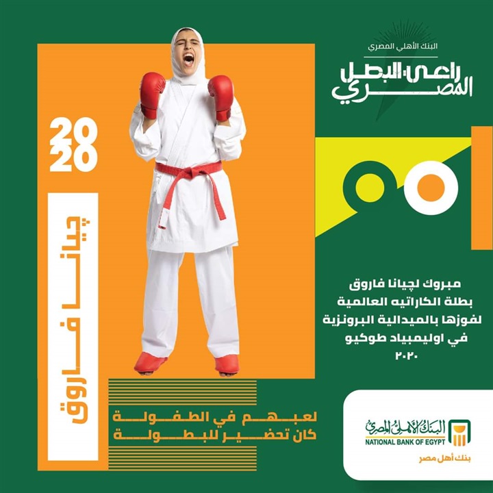 . برعاية البنك الأهلي المصري للبعثة الأولمبية المصرية بأولمبياد طوكيو 2020، فازت چيانا فاروق بطلة الكاراتيه العالمية، بالمـيـدالـية البرونزية لأوليمـبياد طـوكـيـو في الكاراتيه، وهي البرونزية الأولى في تاريخ مصر بالكاراتيه، والتي تقام بطوكيو فى الفترة من 23 يوليو إلى 8 أغسطس المقبل.