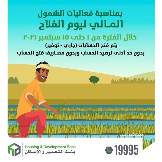 تحت رعاية البنك المركزي المصري، وبمناسبة مبادرات الشمول المالي للاحتفال بعيد الفلاح، أعلن بنك التعمير والإسكان، عبر صفحته الرسمية على موقع التواصل الاجتماعي “فيس بوك”، لعملائه عن إمكانية فتح الحسابات (جارٍ – توفير) بدون حد أدنى لرصيد الحساب وبدون مصاريف فتح الحساب، وذلك في الفترة من 1 وحتى 15 سبتمبر 2021.