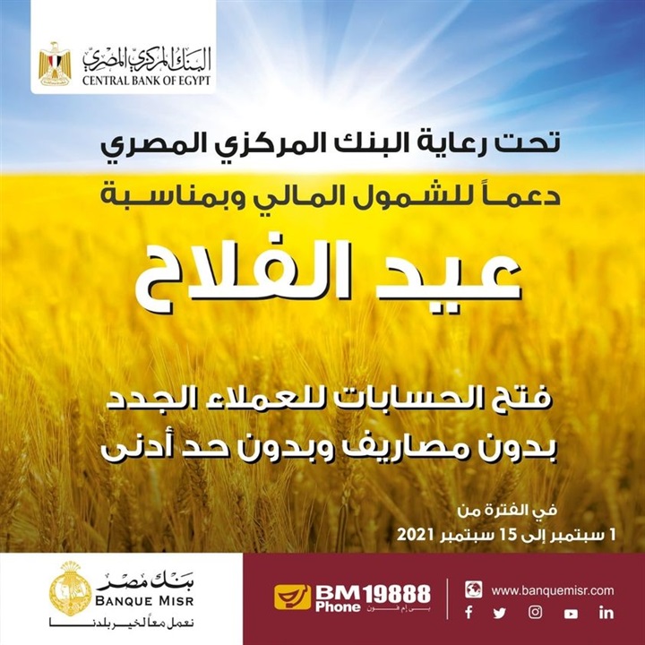 تحت رعاية البنك المركزي المصري، وبمناسبة مبادرات الشمول المالي للاحتفال بعيد الفلاح، أعلن بنك مصر، عبر صفحته الرسمية على موقع التواصل الاجتماعي “فيس بوك”، لعملائه عن إمكانية التمتع بعدد من بباقة من المزايا والعروض المجانية، حيث يتيح البنك فتح الحسابات للعملاء الجدد بدون مصاريف، وبدون حد أدنى لفتح الحساب، بالإضافة إلى إصدار بطاقة ميزة للخصم الفوري، أو البطاقة الكلاسيكية للخصم الفوري مجانًا، وذلك في الفترة من 1 وحتى 15 سبتمبر 2021.