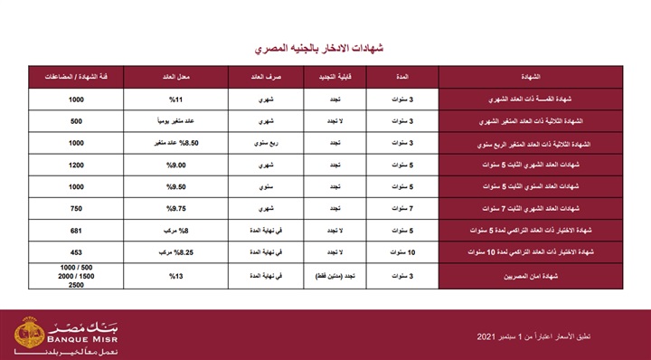 ترصد بنوك مصر، البوابة الرسمية لاتحاد بنوك مصر، أعلى أسعار الفائدة على شهادات بنك مصر، وتأتي تفاصيل الشهادات كالآتي: