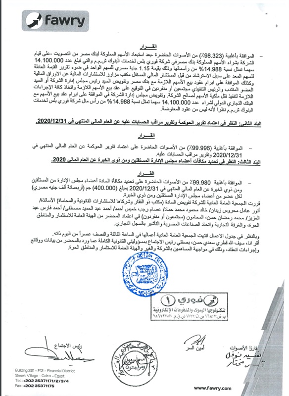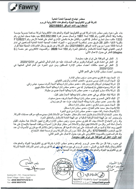 كشف محضر الجمعية، لشركة فوري لتكنولوجيا البنوك والمدفوعات الإلكترونية بداية شهر أغسطس الماضي، مناقشة التغيرات الهيكلية والمالية للشركة عبر منصة التواصل الافتراضية e-megles.