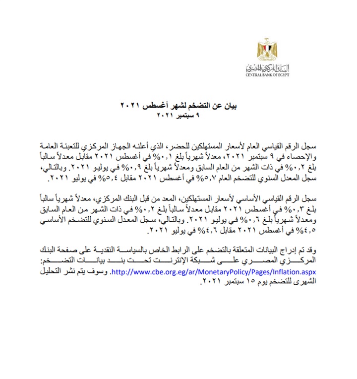 وكشف المركزي أن المعدل السنوي للتضخم الأساسي سجل 4.5% فى أغسطس 2021، مقابل 4.6% فى يوليو.