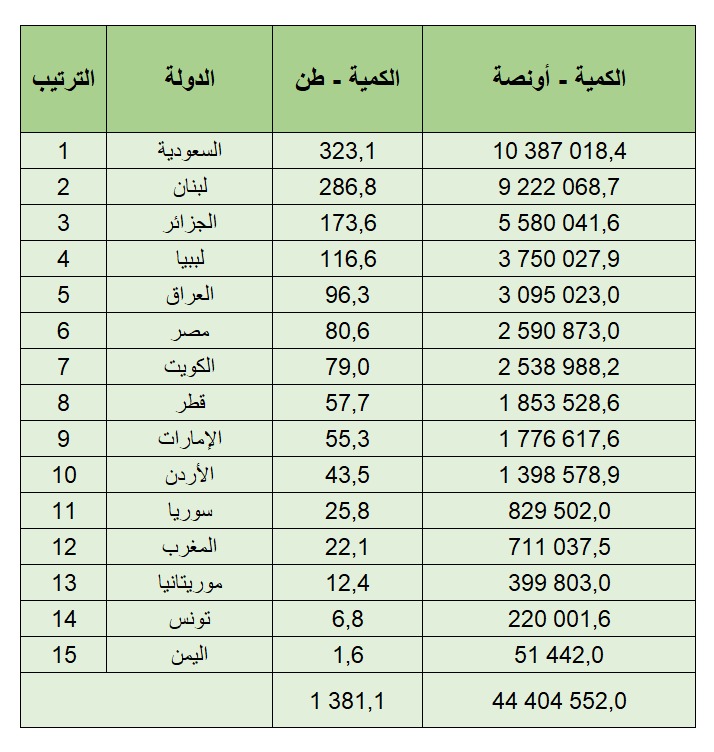 ووفقًا للتقرير فقد بلغ إجمالي ما تملكه الدول العربية من المعدن نحو 1382 طنًا، وهو ما يعادل أكثر من 44.4 مليون أونصة (أونصة كوحدة قياس المعادن النفيسة = 31.103 جرام).