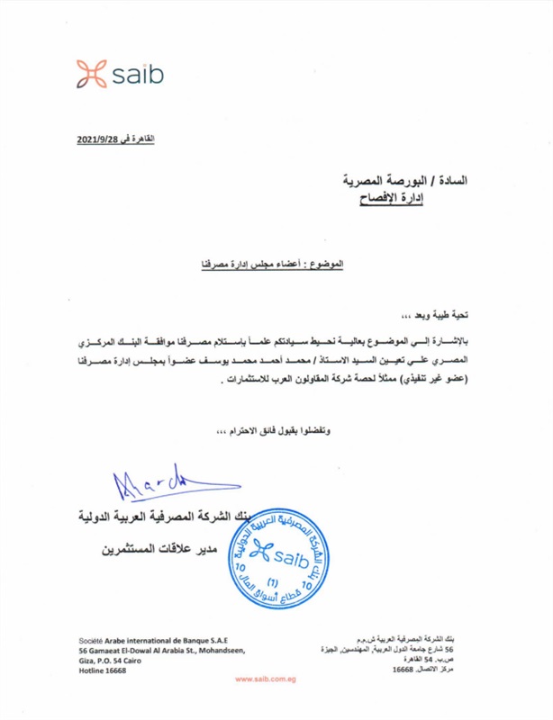 أعلن بنك الشركة المصرفية العربية الدولية Saib، عن تسلمه خطابا بموافقة البنك المركزي المصري على تعيين محمد أحمد محمد يوسف عضوا غير تنفيذي في مجلس إدارة البنك.