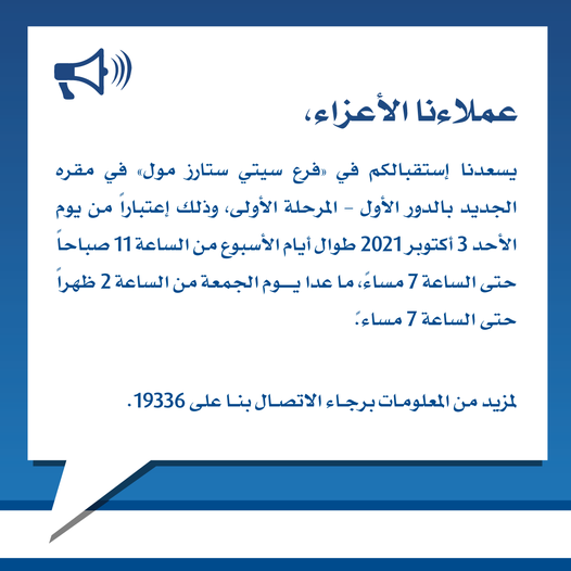 أعلن بنك الكويت الوطني- مصر، عبر صفحته الرسمية على موقع التواصل الاجتماعي “فيس بوك”، عن نقل فرع سيتي ستارز مول إلى مقره الجديد بالدور الأول– المرحلة الأولى، وذلك اعتبارا من اليوم الأحد 3 أكتوبر 2021، طوال أيام الأسبوع من الساعة 11 صباحا حتى الساعة 7 مساء، ما عدا يوم الجمعة من الساعة 2 ظهرا حتى 7 مساء.