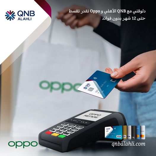 أعلن بنك QNB الأهلي- مصر، عبر صفحته الرسمية على موقع التواصل الاجتماعي “فيس بوك”، لعملاء عن فرصة تقسيط “Reno6 4G” أو “Reno6 5G” من “Oppo” حتى 12 شهرا دون فوائد، بالإضافة إلى إمكانية التقسيط حتى 6 أشهر دون فوائد على مجموعة مختارة من الإلكترونيات، وذلك عند الدفع باستخدام بطاقات بنك QNB الائتمانية.