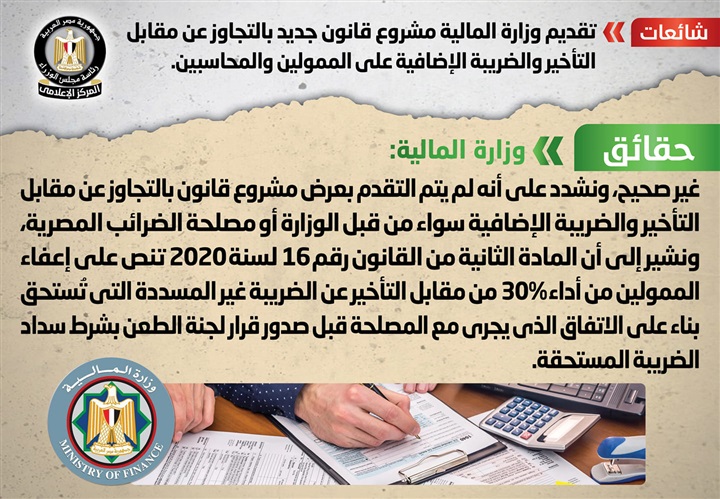 وقد قام المركز الإعلامي لمجلس الوزراء بالتواصل مع وزارة المالية، والتي نفت تلك الأنباء، مُؤكدةً أنه لا صحة لتقديم الوزارة أي مشروع قانون جديد بالتجاوز عن مقابل التأخير والضريبة الإضافية على الممولين والمحاسبين، مُشددةً على أنه لم يتم التقدم بعرض مشروع قانون بالتجاوز عن مقابل التأخير والضريبة الإضافية سواء من قبل الوزارة أو مصلحة الضرائب المصرية، مُشيرةً إلى أن المادة الثانية من القانون رقم 16 لسنة 2020 تنص على إعفاء الممولين من أداء 30% من مقابل التأخير عن الضريبة غير المسددة التي تُستحق بناء على الاتفاق الذي يجرى مع المصلحة قبل صدور قرار لجنة الطعن بشرط سداد الضريبة المستحقة.