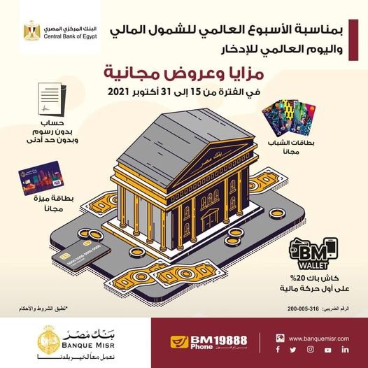 أعلن بنك مصر، عبر صفحته الرسمية على موقع التواصل الاجتماعي “فيس بوك”، لعملائه، عن إمكانية فتح حساب ادّخار بدون رسوم وبدون حد أدنى خلال مبادرة الشمول المالي “الأسبوع العالمي للشمول المالي واليوم العالمي للادخار”، تحت رعاية البنك المركزي المصري في الفترة من 15 أكتوبر إلى 31 أكتوبر، بالإضافة لمزايا وعروض مجانية متعددة: