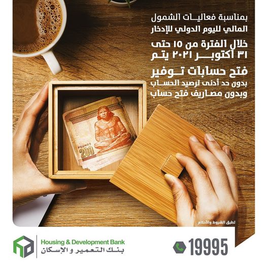 تحت رعاية البنك المركزي المصري وبمناسبة اليوم الدولي للادخار، أعلن بنك التعمير والإسكان، عبر صفحته الرسمية على موقع التواصل الاجتماعي “فيس بوك”، لعملائه عن إمكانية فتح حسابات التوفير بدون مصاريف إدارية، وبدون حد أدنى للرصيد، وذلك خلال الفترة من 15 إلى 31 أكتوبر 2021.