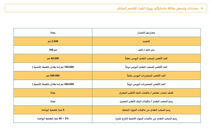 . يقدم البنك الأهلي المصري، مجموعة متنوعة من بطاقات الخصم المباشر، بمزايا تناسب احتياجات كافة العملاء، وتتوافق مع إمكانياتهم، وتحقق لهم أكبر قدر من الرفاهية، من ضمنها بطاقة الخصم المباشر ماستركارد وورلد إيليت، وهي بطاقة خصم مباشر مصممة لعملاء البنك من الأفراد الطبيعيين ذوي الملاءة المالية التي تبلغ ارصدتهم اكثر من 20 مليون جنية (أو ما يعادلها بالعملات الأجنبية).