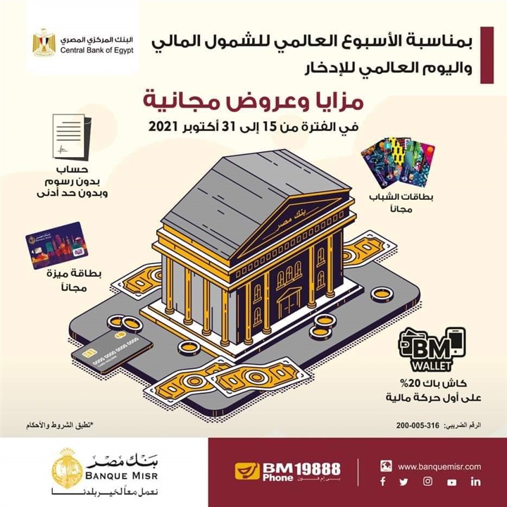 . انطلاقاً من حرص بنك مصر على دعم جهود الدولة في تحقيق الشمول المالي اتساقاً مع رؤية مصر 2030 لتحقيق التنمية المستدامة، قام البنك بالمشاركة في فعاليات الأسبوع العالمي للشمول المالي واليوم العالمي للادخار تحت رعاية البنك المركزي المصري، ويأتي ذلك ايماناً منه بأهمية تحقيق الشمول المالي والذي يهدف إلى تمكين كافة شرائح المجتمع من الوصول إلى المنتجات والخدمات المالية التي تلبي احتياجاتهم المختلفة منها على سبيل المثال؛ حسابات توفير، وحسابات جارية، وخدمات الدفع والتحويل، والتأمين، التمويل والائتمان، وقد حرص البنك على توفير العديد من المزايا والعروض المجانية التي تخدم كافة العملاء وبالأخص فئة الشباب كونهم الفئة الأكبر اتساعاً في المجتمع، وذلك طوال مدة الفعاليات في الفترة من 15 أكتوبر إلى 31 أكتوبر.