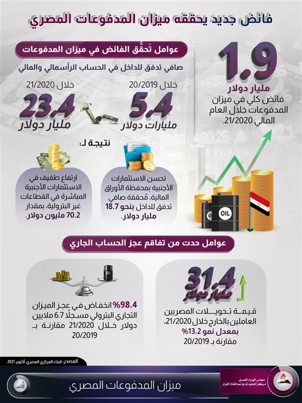 وأشار الإنفوجراف إلى أحدث تطورات أداء ميزان المدفوعات المصري خلال العام المالي 2021/2020؛ حيث سجل ميزان المدفوعات فائضًا كليًّا يصل إلى 1.9 مليار دولار؛ وذلك نتيجة لتسجيل صافي تدفق للداخل في الحساب الرأسمالي والمالي 23.4 مليار دولار خلال 2020/ 2021، مقابل 5.4 مليارات دولار خلال 2020/2019.