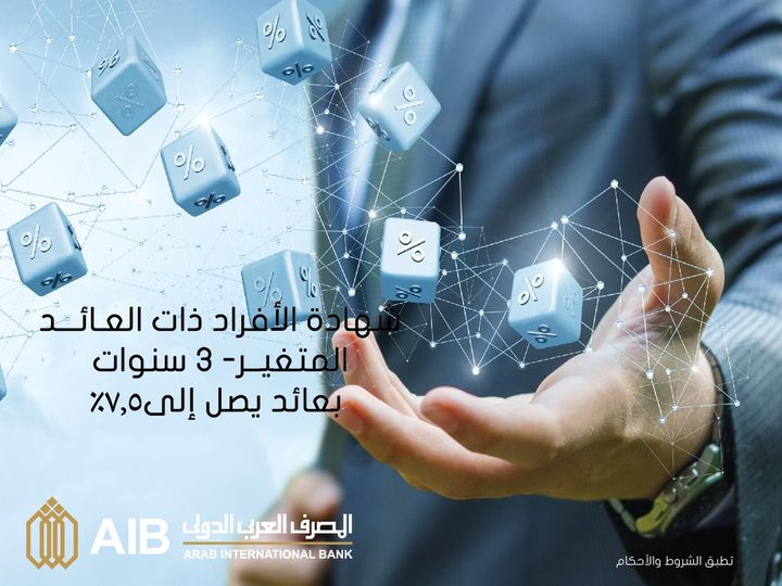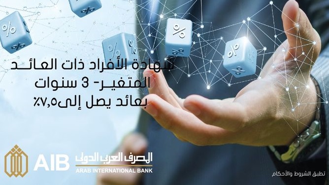 يُقدم المصرف العربي الدولي لعملائه شهادة الإيداع بالجنيه المصري ذي العائد المتغير لمدة 3 سنوات، وبسعر عائد يصل إلى 7.5% سنويًا، وبدوريات صرف شهريًا وربع سنويًا، وبحد أدنى 1000 جنيه للشهادة.