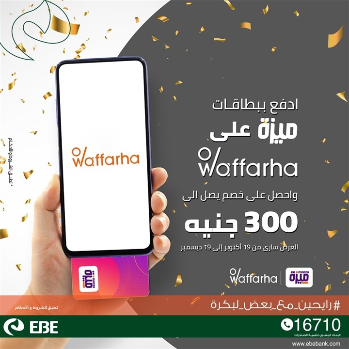 . أعلن البنك المصري لتنمية الصادرات، عبر صفحته الرسمية على موقع التواصل الاجتماعي “فيس بوك”، لعملائه عن إمكانية الاستمتاع بخصم فورى 100 جنيه مع كل معاملة مشتريات اونلاين ببطاقة ميزة من Waffarha بقيمة 300 جنيه أو أكثر، ويُشار بأن الحد الأقصى لمبلغ الخصم هو 300 جنيه للبطاقة الواحدة خلال فترة العرض.