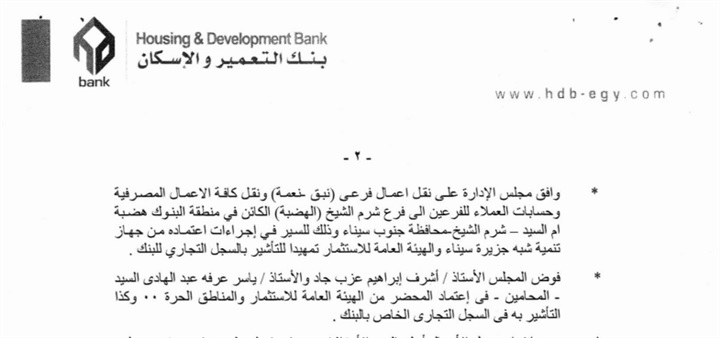 . وافق مجلس إدارة بنك التعمير والإسكان، في جلسته المنعقدة أمس، على نقل أعمال فرعي نبق ونعمة، ونقل كافة الأعمال المصرفية وحسابات العملاء للفرعين إلى فرع شرم الشيخ (الهضبة) الكائن في منطقة البنوك هضبة أم السيد- شرم الشيخ محافظة جنوب سيناء.