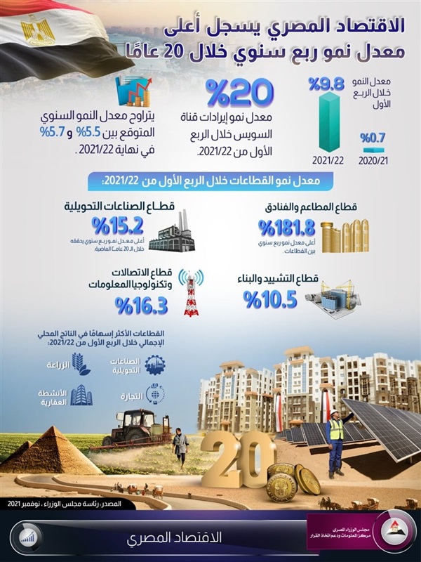وحقّقَ الاقتصاد المصرى معدل نمو بلغ 9.8% خلال الربع الأول من عام 2021/2022، وهو أعلى معدل نمو ربع سنوي على امتداد الـ 20 عامًا الماضية، مقارنة بمعدل نمو 0.7% خلال الربع الأول من عام 2020/2021. ومن المتوقع أن يتراوح معدل النمو السنوي بين 5.5% و5.7% في نهاية عام 2021/2022.