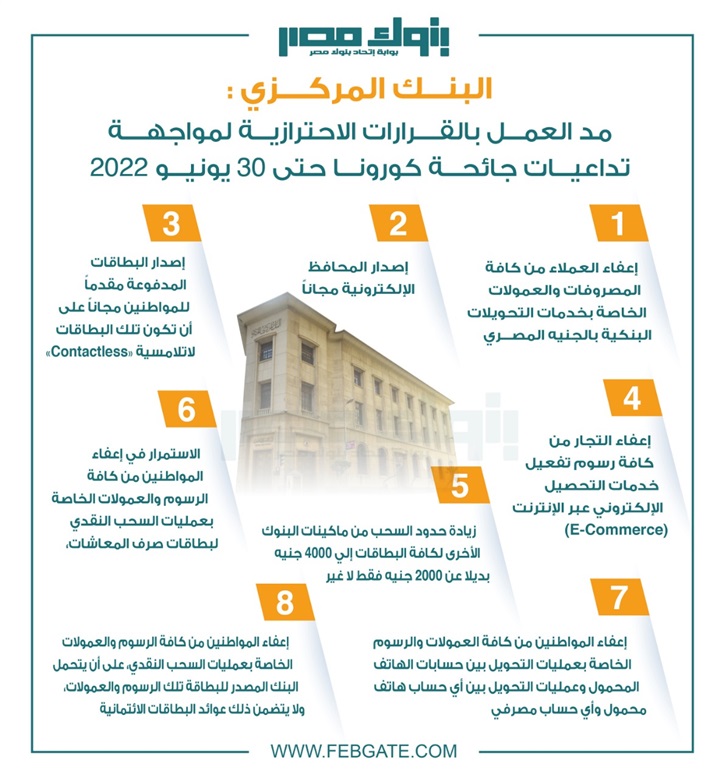 قرر مجلس إدارة البنك المركزي المصري مد سريان بعض القرارات، التي سبق اتخاذها في مواجهة تداعيات جائحة “كورونا”، وذلك لفترة جديدة مدتها 6 أشهر اعتباراً من 1 يناير وحتى 30 يونيو 2022، وجاءت القرارات كالتالي: