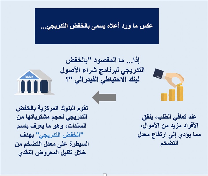 عندما يبدأ الطلب في التعافي، يمكن أن تبدأ البنوك المركزية في عملية “الخفض التدريجي”، أي تبدأ في تقليل مشتريات الأصول لتجنب السيولة الزائدة في السوق، والسيطرة على الضغوط التضخمية في ظل انتعاش النشاط الاقتصادي. يمكن أن يحدث هذا الأمر بالتزامن مع ارتفاع أسعار الفائدة. وبناء على ذلك، يُقصد بالخفض التدريجي لبرنامج شراء الأصول لبنك الاحتياطي الفيدرالي: عملية السحب البطيء للحزم التحفيزية التي يوفرها البنك المركزي خلال فترات تباطؤ النمو الاقتصادي (أي تقليل المشتريات من السندات).