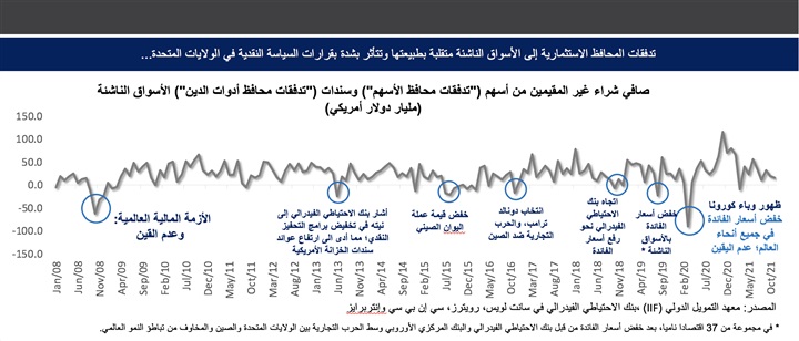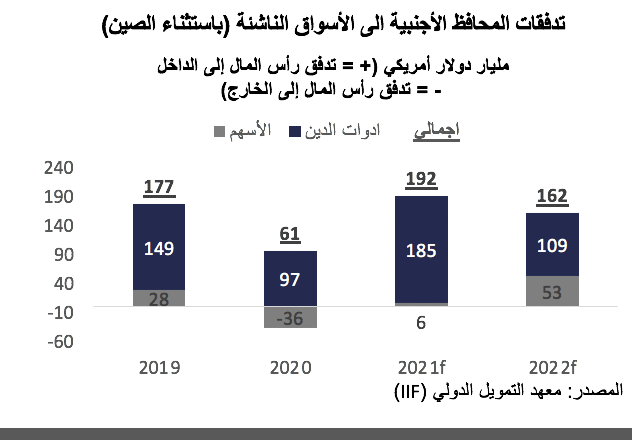 هل من المحتمل الآن حدوث “موجة هروب” للمحافظ الاستثمارية من الأسواق الناشئة؟ على الرغم من الانكماش المتوقع للسيولة العالمية في عام 2022 وتوقعات رفع أسعار الفائدة في الولايات المتحدة، إلا أن معهد التمويل الدولي (IIF) يرى أن حدوث “موجة هروب للمحافظ الاستثمارية” من الأسواق الناشئة أمر غير مرجح.ومع ذلك، فإن المعهد لا يرى عودة النشاط الاستثماري إلى مستويات ما قبل الوباء بعد.