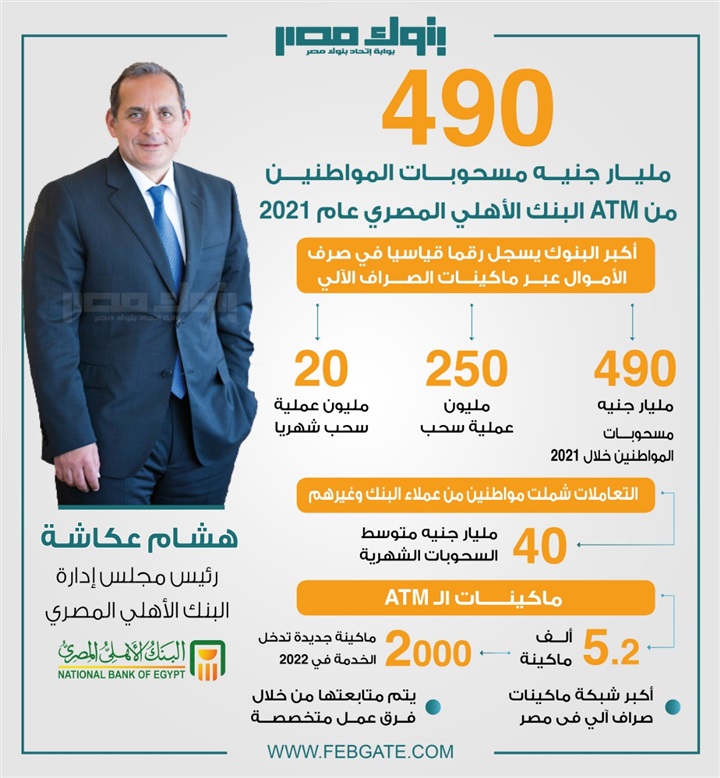 كشف هشام عكاشة رئيس مجلس ادارة البنك الأهلي المصري عن أن المواطنين سحبوا 490 مليار جنيه (حوالى نصف تريليون جنيه) على مدى 12 شهر من اول يناير 2021 و حتى اخر ديسمبر 2021 من ماكينات الصراف الالى الخاصة بالبنك الاهلى المصرى.