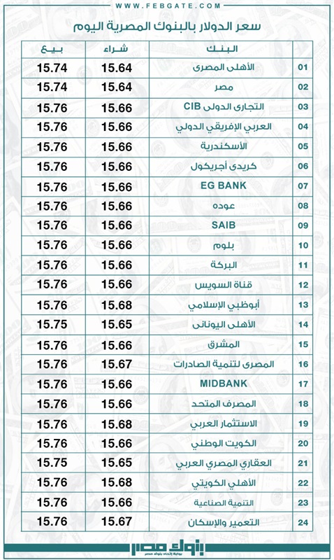 يذكر أن سعر صرف الدولار استقر في نهاية تعاملات الخميس الماضي في 24 بنكًا، وسجل أعلى سعر في بنوك (أبو ظبي الإسلامي – الاستثمار العربي – الأهلي الكويتي) عند مستوى 15.68 جنيهًا للشراء، و15.76 جنيهًا للبيع، وسجل أقل سعر في بنوك (الأهلي المصري – مصر) عند مستوى 15.64 جنيهًا للشراء، و15.74 جنيهًا للبيع.