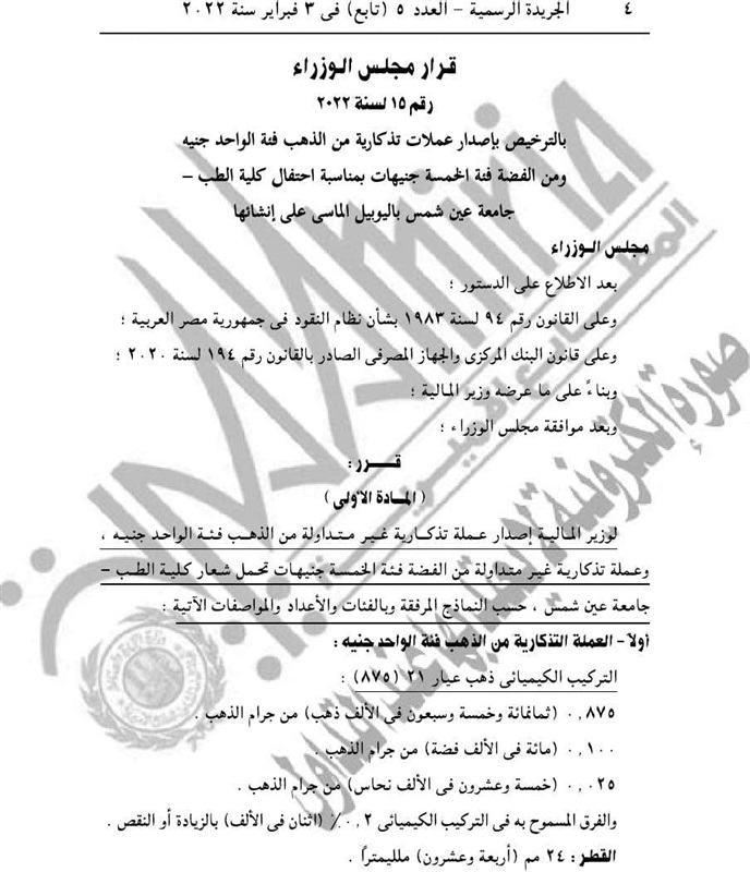 ونص القرار على إصدار عملات تذكارية من الذهب فئة 1 جنيه، ومن الفضة فئة 5 جنيهات، بمناسبة احتفال كلية الطب بجامعة عين شمس باليوبيل الماسي على إنشائها.