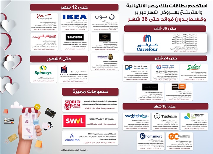 أعلن بنك مصر، عبر صفحته الرسمية على موقع التواصل الاجتماعي “فيس بوك”، عن أحدث عروضه لشهر فبراير، حيث يمكن التقسيط بدون فوائد حتى 36 شهر من العديد من المتاجر والماركات، وذلك باستخدام بطاقات بنك مصر.