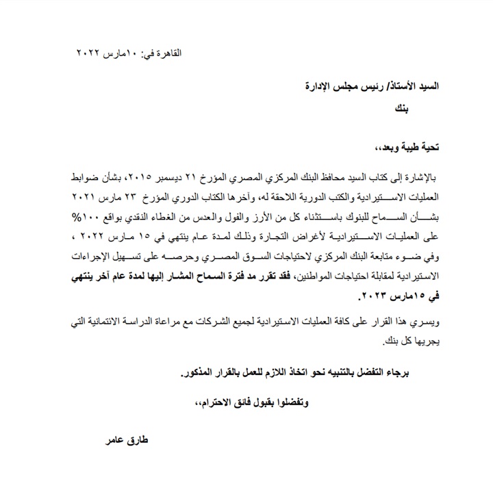 . أصدر البنك المركزي المصري، اليوم الأحد، قرارا بمد فترة استثناء بعض السلع الغذائية الأساسية، وهي الأرز والفول والعدس، من الغطاء النقدي بواقع 100% لمدة عام، ينتهى في 15 مارس 2023.